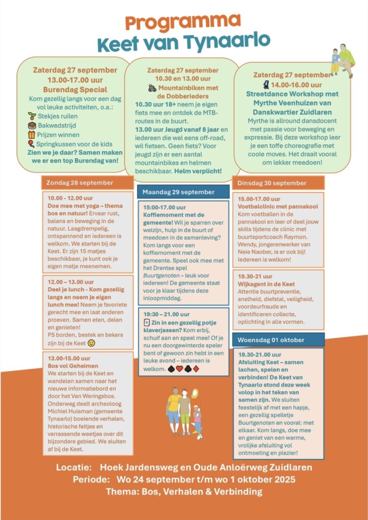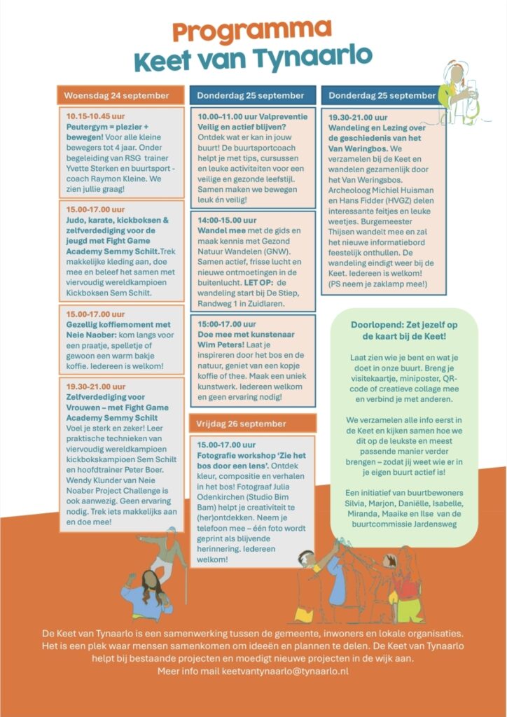 Samen met de Keet van Tynaarlo heeft de buurtcommicie van de Jardensweg een week met diverse activiteiten georganiseerd. Kom kijken, doe mee en laat je inspireren. De activiteiten zijn voor jong en oud, zie het programma.